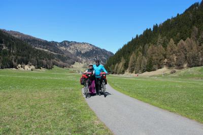 So jetzt sitzen wir beim Frühstücken und ich denk schon an die Steigungen und Serpentienen und hab gar keinen richtigen Appetit. Susi schmeckt's und freut sich schon auf die heutige Etappe. Frühstück fertig, Pension bezahlt, Räder bepackt und ab gehts zuerst über die Grenze in die Schweiz, dann kommt eine Abbiegung nach Samnaun 6km aber wir bleiben auf der Strasse leicht bergauf nach Martina. Geradeaus würde es nach St. Moritz gehen aber wir biegen links wieder über die Grenze nach Österreich Nauders ab. Jetzt sind Sie da, die Serpentienen 7km steil bergauf. Vor uns sind 2 Radelfahrer (ohne E-Unterstützung) mit einem Schild hinten am Fahrrad "Nürnberg - Sizilien". Wir fahren vorbei mit dem Gruss "München - Rom". Um den Akku zu schonen (nicht dass mir mitten in der Steigung der Saft ausgeht) fahr ich mit der mittleren Unterstützung "Tour". Meine Pumpe (Herz) arbeitet wie verrückt, um mich und mein Rad auf den Pass zu kriegen. Ab und zu sagt Susi was zu mir, ich denk mir nur, wie kann man bei der Anstrengung noch reden? Ich sag nicht's und fahr konzentriert weiter. Die Balken von der Akku-Anzeige geht einer nach dem anderen weg. Ich fang zu rechnen an, pro 3km bergauf einen Balken. 3 Balken hab ich noch, aber wie weit ist es noch nach Nauders und dann gehts noch weiter zum Reschensee. Der 3. Balken ist weg, oh, oh, wie ist es wenn man schieben muss? Vorne kommt das 1. Haus, Super geschafft, die Norbertshöhe in 1460m Höhe. Jetzt gehts leicht bergab nach Nauders. Kurz vorm Ortseingang sind ein paar Radfahrer und die Polizei. Ich halte an und frag die Radelfahrer ob Sie geblitzt worden sind. Nein, Sie warten auf die Radelfreunde die noch nicht so geübt sind. Wir fachsimpeln noch ein bisschen und fahren dann weiter der Via Claudia. Im Schloss Nauders wollten wir einkehren und die Akkus laden, aber da ist alles zu also radeln wir weiter nach Reschen. Wunderschöne Landschaft, nur leicht bergauf, geteerter Radelweg, Sonnenschein, was will man mehr. Jetzt sind wir auch schon am Grenzübergang nach Italien. Hier kehren wir ein und laden unsere Akkus. Weiter gehts zum Reschensee Richtung Meran auf der rechten Seite. Nur ein Weg für Radelfahrer Super, Super, Super. Ab jetzt gehts nur noch bergab bis Meran. St. Valentin, Burgeis, Schleis, Laatsch, Glurns, hier werden wir Übernachten. Glurns ist eine sehr alte Stadt (Dorf) mit einer komplett erhaltenen Stadtmauer, so was hab ich noch nie gesehen, sehr beeindruckend.
