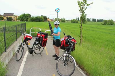 Um 8:00h gehen wir zum Frühstücken und sind dann um 9:30h auf dem Fahrrad. Wie kommen wir jetzt am besten wieder auf den Radelweg. Bei der Abfahrt fragen wir den Frühstückskellner, der uns zum Gardasee schicken würde. Wir bedanken uns höflich für die Auskunft und fahren auf gar keinen Fall zurück. Susi wäre die letzten 5-6 km zurückgefahren, um auf den Radelweg aufzufahren, wo wir gestern Nachmittag zur Übernachtungssuche abgebogen sind. Für mich kommt ein Zurückfahren nur im grössten Notfall in Frage und so überzeuge ich Susi, nur ein paar Meter der sehr stark befahrenen Schnellstrasse ohne Radelweg zu fahren und dann in die nächsten Seitenstrasse einzubiegen. Und wirklich, nach ca. 1 km kommt links eine Seitenstrasse, die wir einbiegen und wir gefühlt in die richtige Richtung fahren. In einer kleinen Ortschaft fahren wir rechts, dann links und nochmal rechts, ein Stück geradeaus und dann nochmal links und plötzlich waren wir wieder auf dem Radelweg "Via Claudia". Ich hab natürlich so getan, als ob ich genau wusste wo ich hinfahre und hab Susi gefragt "na, bin ich nicht der beste Scout"? Susi war sehr erstaunt, dass wir ohne grossen Umweg den Radelweg gefunden haben und ich glaub, jetzt hab ich wieder 2 "Abkürzungen" gut. Nach 8 km waren wir in Verona und voll Selbstvertrauen durch den so schnell gefundenen Radelweg hab ich die Führung durch Verona übernommen. Entgegen unserem Radelbuch fahren wir mitten durch Verona, das spart uns mindestens 2 km wenn ich den Stadtplan anschaue. Weder Einbahnstrasse noch eine Baustelle hindern uns die kürzeste Route durch Verona zu fahren. "Darf man eigentlich mit dem Fahhrad eine Einbahnstrasse in der falschen Richtung durchfahren" fragte Susi mich, und ich sagte "natürlich, mit dem Radel darf man das" mit dem festen Glauben, dass uns keine Polizei erwischt. So, jetzt sind wir durch Verona durch und fahren Richtung Süden zu unserem Tageszwischenziel "Isola della Scala". Eigentlich sind es nur noch 10km dorthin, aber es ist eine sehr stark befahrene Schnellstrasse, und ich weiss, dass Susi lieber die kleinen Nebenstrassen fahren will. Also ist meine ganze Abkürzung dahin, weil wir rechts nach Vigasio wieder auf den im Radelbuch beschrieben Radelweg müssen. Aus den gesparten 2km werden 10km mehr und ich denk mir, dass ich mich zukünftig wieder an unser Radelbuch halte. So, jetzt haben wir unser Tagesziel Ostilglia erreicht und suchen uns eine Unterkunft für 2 Tage.
